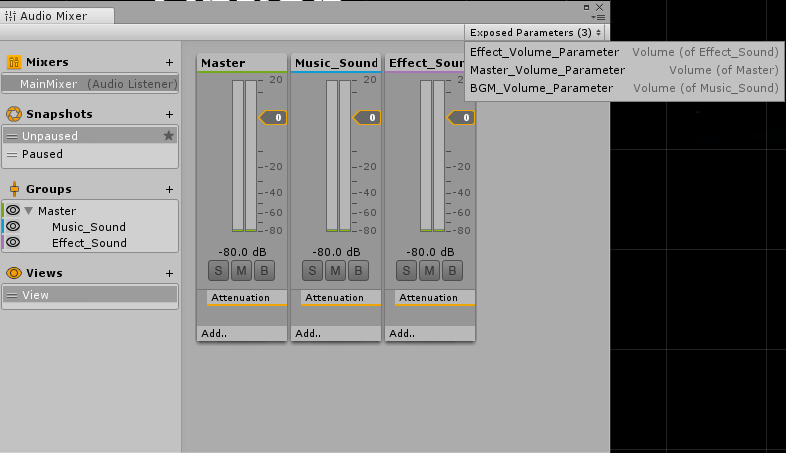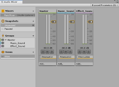 먼저 메인믹서를 생성하고, Mixer 그룹을 두개 더 생성한다. (Master , Music_Sound , Effect_Sound) 의 그룹이 있을 것이다.
